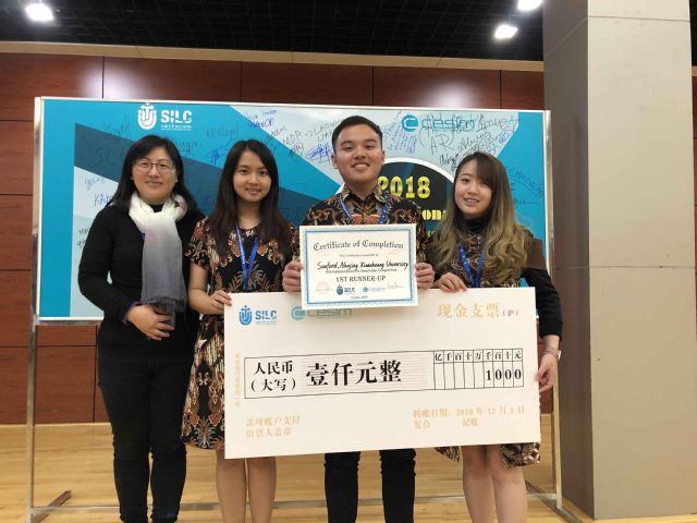 2018“一带一路”国际商业模拟大赛于12月1日在上海大学落下帷幕,我校beat365官方网站印度尼西亚留学生林家安、詹如意、郭奕雪在李燕、朱义令两位老师的指导下,发挥出色,荣获决赛留学生组团体一等奖。