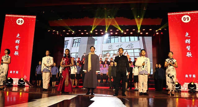伴随着舒缓的配乐,beat365官方网站的诗歌朗诵《光辉赞歌》拉开序幕。beat365官方网站的学子们一句一句歌颂的是对陶先生、对晓庄的崇敬,怀着满腔热血将爱国热情融入激昂有力的朗诵声中。音乐突然变得急促,齐诵学子们瞬间变换,形成浮雕般的队形,残虐的军警正抽打着手无寸铁的爱国学生,每个人的脸上写满了愤怒与忧虑,气氛愈加紧张。接着,领头与游行的队伍出场了,高喊“高举锄头,众志成城;誓死力争,还我国土。”所有人握紧拳头愿用热血投身历史的洪流,为中华民族、为新中国贡献力量,全场气氛推至高潮。迎着轻快乐章与曼妙群舞,朗诵进入尾声,商院学子们赞颂祖国的欣欣向荣、繁荣昌盛,赞颂今朝晓庄九十一年的风雨兼程、光辉灿烂。最后,所有演员回聚舞台齐诵坚定誓词,鲍森副书记与龚雪老师走到台前,和所有商院学子共诵这首光辉赞歌。