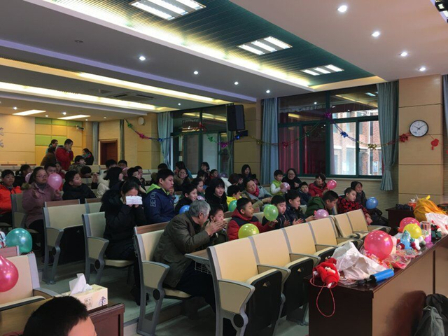 随着欢快的音乐声响起,活泼的《兔子舞》一下吸引住了所有孩子的视线,跟着台上的志愿者们一起载歌载舞,现场气氛热烈;伴随着歌曲《采蘑菇的小姑娘》和《粉刷匠》的熟悉旋律,志愿者们邀请孩子们上台一同表演。在游戏《击鼓传花》中,志愿者们刚讲解完规则,许多孩子便走上台参加,少数害羞的孩子也在老师的鼓励下勇敢地加入。每个拿到“花”的孩子,都做了一个简短的自我介绍,或唱一首歌,或背一首诗,或讲一个自己的小心愿,在获得掌声的同时也得到了志愿者们精心准备的小礼物——玩偶。接着,在画画环节中,由一位志愿者在黑板上做示范,孩子们依葫芦画瓢在纸上作画,每个孩子画完都主动把画给志愿者们看。随后,生动可爱的歌舞表演《数鸭子》引得全场一起摇摆,好不热闹。活动的最后,志愿者们和现场的老师、孩子一起唱起了《让我们荡起双桨》,歌声回响在整个报告厅内,久久不能散去。在活动宣布结束的那一刻,现场掌声不断。孩子们不愿离开报告厅,志愿者们便留下来和孩子们聊天,一起讨论他们的画作,每个人脸上都洋溢着快乐的笑容。