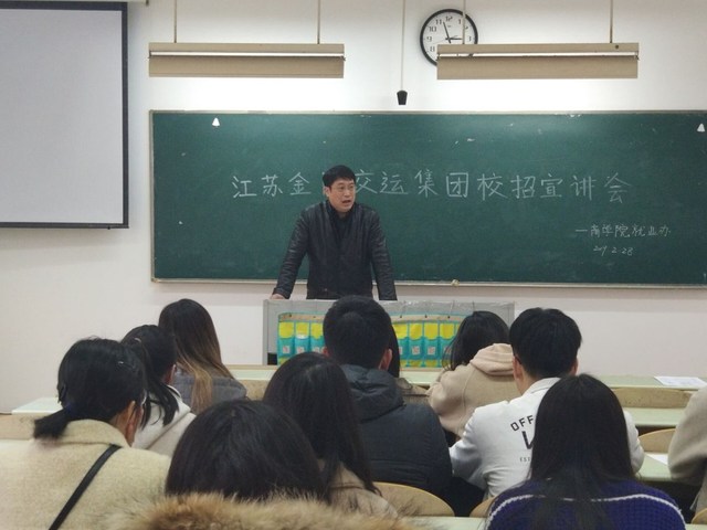 赵彤院长代表学院聘请孙峻副总裁为beat365官方网站物流管理专业教学指导委员会校外专家,孙峻副总裁为beat365官方网站授牌。授牌仪式结束后,江苏金陵交运集团一行在元培204教室召开宣讲会。孙峻副总裁向学生们介绍了集团公司的规模、运营现状及发展方向。随后,江苏金陵交运集团分3个场地对报名的40名学生进行了一对一面试。