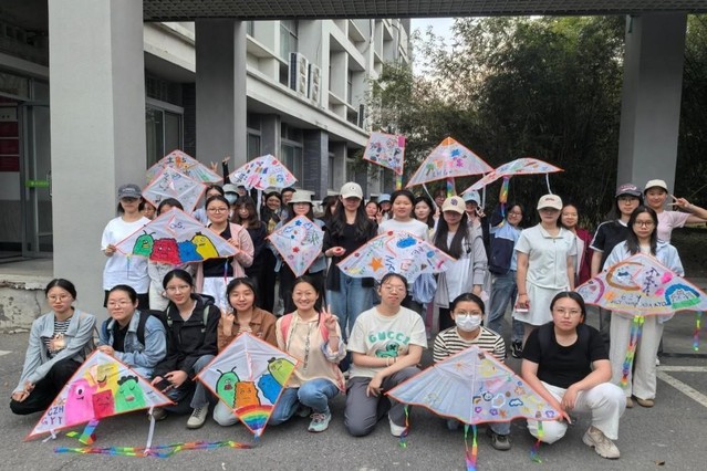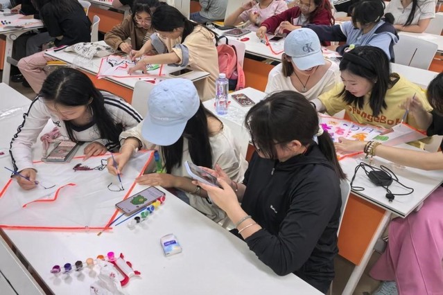 活动共设置“绘心绘意——风筝绘画”和“放飞心声——风筝放飞仪式”两个环节。在“绘心绘意”环节,同学们3人自由组队,手握画笔,开启创意之旅,在风筝画布上尽情挥洒灵感,或是勾勒对未来的憧憬,或是描绘内心的烦忧,或是倾诉对亲友的感恩。色彩在画布上灵动跳跃,每一笔都饱含着独特的情感,同学们在创作中释放压力、舒缓情绪。