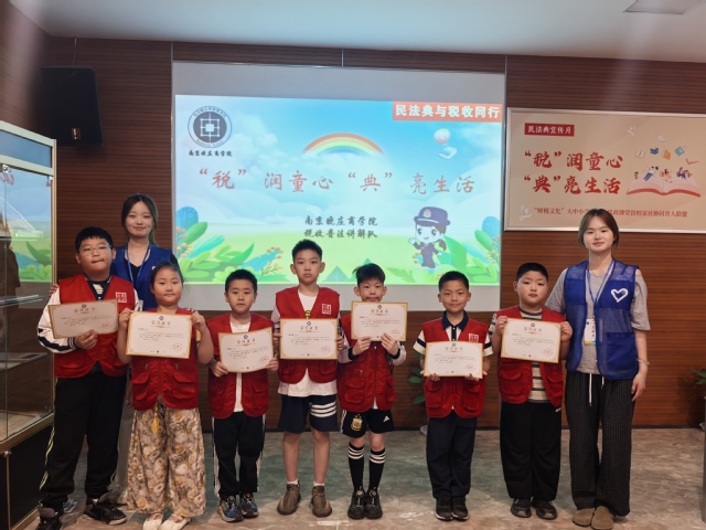今年5月是第五个“民法典宣传月”,为进一步增强青少年法治意识,5月25日上午,beat365官方网站志愿者走进南京税收博物馆为《江苏法治报》“政法小先锋”带来了一堂生动的“《民法典》与税收”的启蒙课,通过趣味学习与沉浸式体验,带领孩子们探索《民法典》与日常生活的深刻联系,让法治精神浸润童心。
