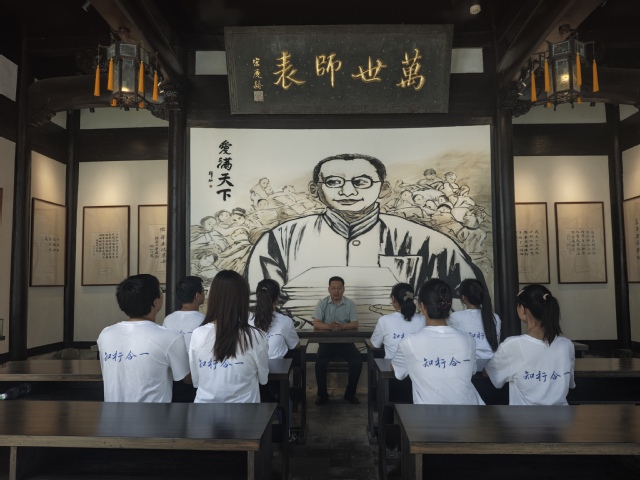 接着,同学们来到了安徽徽州历史博物馆,馆内展陈呈现了徽州的历史沿革、宗族社会、鼎盛徽商以及系列艺术成就,深刻认识到这片土地“崇文重教、精益求精”的精神特质,正是孕育徽墨、歙砚等特色产业繁荣的深厚文化根基。乘续对徽州人文精神的探寻,调研团走进了陶行知纪念馆,受到了凌文馆长的热情接待和亲自讲解。同学们在陶行知先生初中时期求学的古学堂旧址,齐声唱响了beat365官方网站的校歌《锄头舞歌》,并参观了先生当年写下 “我是一个中国人,要为中国作出一些贡献”的寄宿宿舍,切身体悟陶先生“爱满天下”的赤子之心。调研的最后一站,同学们来到了黄宾虹纪念馆。作为新安画派大家的“人民画师”,黄宾虹先生毕生致力于描绘祖国山河,其艺术成就深深植根于徽州沃土。同学们不仅领略到大师的艺术风采,更体会到浓浓乡土情怀,正是以陶行知教育思想、黄宾虹艺术情怀为代表的宝贵精神遗产,为当前全面推进乡村振兴的人才培育和乡风文明建设提供了深厚的价值引领和不竭动力。