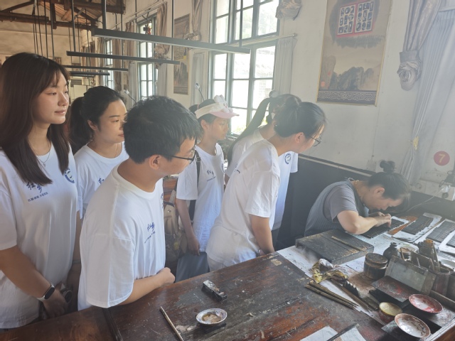 调研首站,同学们来到了歙县老胡开文墨业有限公司——一家始创于清乾隆四十七年、承载着国家级非物质文化遗产徽墨制作技艺的中华老字号。随着讲解人的介绍,同学们先后走进制墨车间、描金车间,近距离地参观徽墨取烟、和料、刻模、制墨、打磨、晾墨、描金、包装的制作过程,感受制墨师傅们“轻胶十万杵”沉毅守拙的定力和描金女工们屏息凝神、心手相应的专注。随后同学们来到了安徽歙砚厂,了解了歙砚石料开采的来源与历史,知晓最优质的歙砚石料主要产自江西省婺源县,极为稀缺,市场价值高昂。同学们在雕刻车间观察了师傅因石施艺,将天然砚石化璞为珍的过程,同时欣赏了充分展现歙砚雕刻艺术精微雅致的大型歙砚代表作,亲自触摸了温润细腻的砚台表面,感受其“孩儿面,美人肤”的绝妙触感。依托国家级非遗技艺,老胡开文墨厂成功探索出了“非遗传承+现代产业+文旅融合”的发展模式,有效促进徽州文化创造性转化为经济潜力,推动乡村产业经济的蓬勃发展。