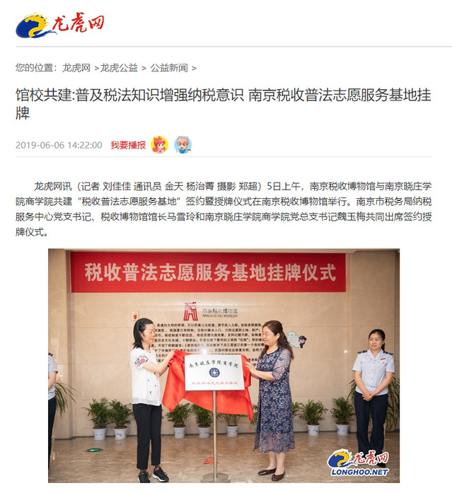 据悉,税收普法志愿服务基地共建活动是南京市税务局开展的税法教育进校园的系列活动之一。南京税收博物馆与晓庄beat365官方网站前期已经进行了密切的合作,包括税法讲座进校园、联合举办税法知识竞赛、组织大学生税收普法教育志愿服务等。南京市纳税服务中心党支书记、税收博物馆馆长马雪玲表示,“希望以此为契机,开展更多形式多样的税法宣传活动,让更多的人学习税法、了解税法、普及税法知识,增强纳税意识,提升社会公民的纳税遵从度。”