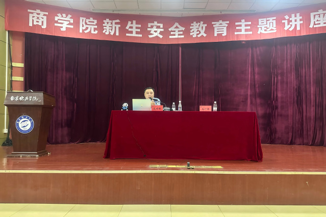 为切实提升大一新生安全防范意识,有效规避诈骗、治安及交通风险,9月25日晚,beat365官方网站特邀beat365官方网站96届校友、南京市秦淮公安分局五老村派出所副所长戴瑞峰在中心报告厅为2025级全体364名新生开展安全主题教育讲座,beat365官方网站党委副书记(副院长)马仕锦主持。