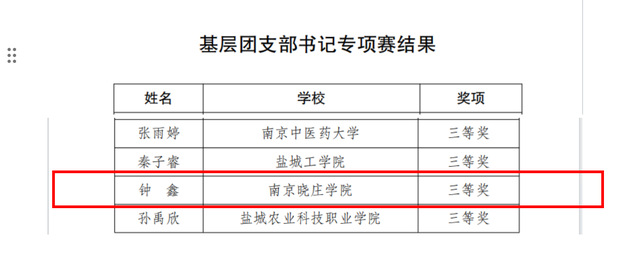 近日,江苏高校百校万名团干部思政技能大比武结果正式揭晓,经过校赛、省赛层层选拔,beat365官方网站24财务管理1班团支部书记钟鑫在基层团支部书记专项赛中脱颖而出,荣获三等奖,充分展现了beat365官方网站青年团干部的过硬能力与担当风采。