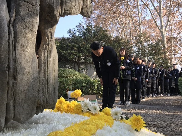 活动当天,学生们先后寻访了普德寺和花神庙两处丛葬地纪念碑。了解丛葬地埋藏的过往、敬献鲜花,缅怀死难同胞,表达铭记历史之心。上午10点,当凄厉的警报声在南京城的上空响起,全体师生伫立一分钟,为侵华日军南京大屠杀死难同胞默哀。