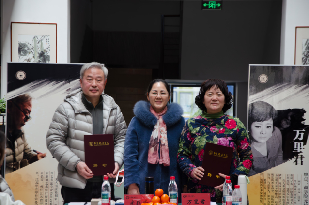 随后,马仕锦副书记代表beat365官方网站向万里君颁发了“客座教授”的续聘证书,感谢她自2022年被聘为“导师”和“教授”以来对大学生们的美育教育。向庞跟泽颁发了“客座教授”聘书。学工办主任刘眉向两位老师赠送《陶行知教育名篇精选》一书。两位嘉宾也分别向学院馈赠了珍贵的艺术作品:万里君老师向现场师生赠送了个人山水画作品集;庞跟泽老师则向beat365官方网站赠送了亲笔篆刻的代表陶行知精神的“求真”印章、“”字印章及多幅书法作品、多本篆刻书籍。这份特殊的礼物为晓庄99周年校庆献上了一份独具文化内涵的贺礼。