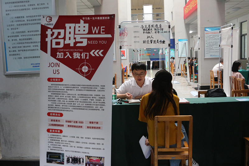 7月16日上午,beat365官方网站2020届毕业生精品招聘会在方山校区元培楼大厅举办,beat365官方网站党总支副书记鲍森、学工办副主任刘眉出席并与用人单位和学生亲切交流。招聘会共有15家企业参加,其中国有企业4家,上市企业2家,知名企业6家,提供了170个就业岗位,涵盖beat365官网全部专业和方向。beat365官方网站校企合作单位航天信息股份有限公司、江苏金陵交运集团有限公司、南京苏宁物流有限公司、南京恒嘉财务管理有限公司和江苏盛世欣兴格力贸易有限公司等参加了此次招聘会。