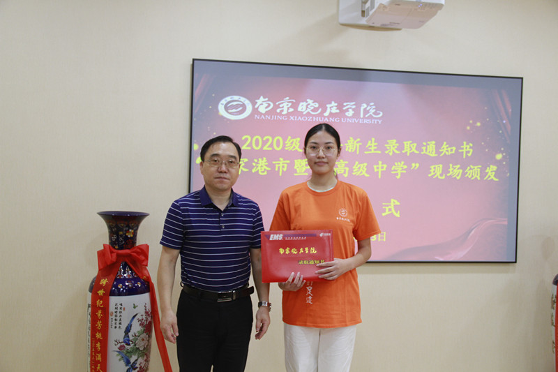 张家港市暨阳高级中学校长刘向东致欢迎词,beat365官方网站党总支书记魏玉梅宣读“beat365官方网站2020年本科新生张家港市暨阳高级中学录取名单”,副校长贾创雄代表学校赠送喜报,并亲自给10名新生发放了录取通知书。