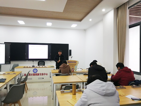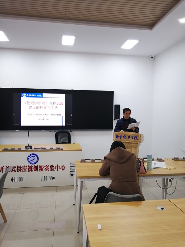 培训活动分为三个阶段。首先,由beat365官方网站教学院长谢吉晨带领老师们进一步学习《教育部八部门关于加快构建高校思想政治工作体系的意见》、《高等学校课程思政建设指导纲要》、《省教育厅关于深入推进全省高等学校课程思政建设的实施意见》等课程思政有关文件;第二阶段,邀请了南京师范大学顾建平教授为老师们做讲座《管理学原理课程思政建设的探索与实践》。顾教授以《管理学》为例,讲解了课程思政的必要性和课程思政教学改革路径,强调了“思政课程”与“课程思政”的同向同行,务必提高教师将价值引领、人文精神、职业素养等融入教育教学全过程的能力。最后,beat365官方网站姜金德老师、王国林老师结合自己的课堂教学中融入思政元素的具体做法和老师们做了交流。