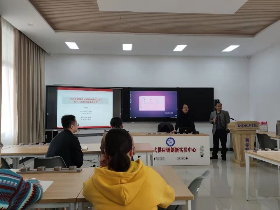 4月13日下午,东南大学经济管理学院博士生导师、中组部“万人计划”青年拔尖人才、江苏省“青年社科英才”刘修岩教授做客beat365官方网站“方山经管讲坛”,应邀在供应链创新实验中心作题为《空间发展模式如何影响城市创新》的专题报告。报告会由经济与金融专业负责人王国林博士主持,青年教师代表及18级经济与金融专业全体学生参加。