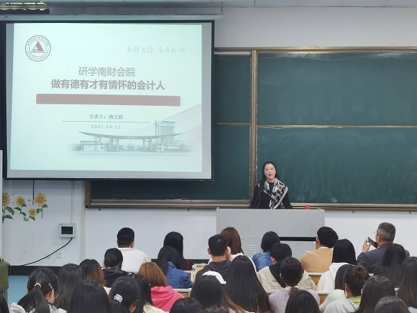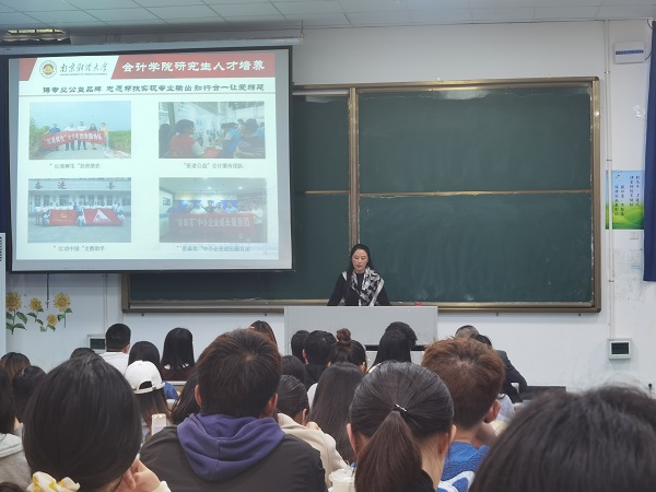 姚文韵院长以《做一个有德有才有情怀的会计人》为题,介绍了南财会计学院依托专业特色和学科优势,在学科专业建设、社会服务等方面取得的成绩,重点介绍了该院近两年研究生招考政策、招录人数、人才培养等方面情况,特别是学院在“大智移云物区”背景下,强化学生能力培养和素质提升的一系列举措,勉励青年学生端正考研动机,把握时代趋势,努力做一名高素质、复合型的会计人。姚院长的指导高屋建瓴,语言轻松幽默,现场气氛热烈。