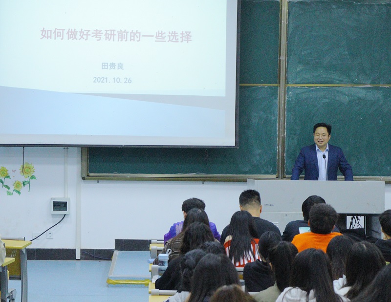 河海大学经济与金融学院副院长、博士生导师田贵良教授结合自身求学经历和指导研究生的体会,从为什么读研、在哪里读研、如何成功考研、考研的若干建议等方面进行指导。史兹国书记从人口与教育结构变化角度切入,指出提升学历的必要性,通过具体翔实的招生数据和典型事例,强调考研在提升个人能力素质和职业发展际遇等方面发挥的重要作用,希望同学们抓住当前扩招机遇,结合自身实际,尽快明确目标,保持良好心态,端正复习态度,统筹兼顾,科学合理安排时间,争取早日实现自己的梦想。学院将尽力为同学们营造良好的考研氛围,为高质量就业打下坚实的基础。