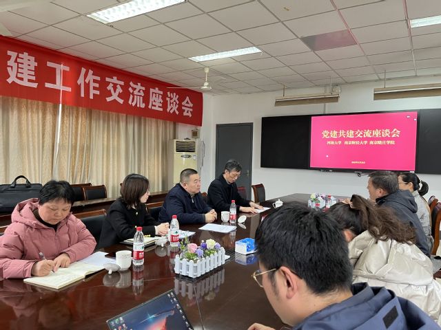 讲座后,河海大学外国语学院书记雷贵荣、南京财经大学会计学院党委书记卜金涛和beat365官方网站党委书记史兹国就高校党建工作开展交流座谈会。beat365官方网站教师第二党支部副书记杨治菁作省级样板支部创建工作汇报,三所高校互相交流取经,围绕教师党支部和学生党支部工作的品牌创建活动交流优秀经验,共同探索新时代高校党建与事业深度融合新路径,并探讨未来长期合作共建可行性。