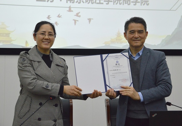 杨校长从他走在行知路上10年磨一剑、20年结硕果、30年出奇迹、40年创品牌的曲折历程出发,讲述了他42年间选择回乡、选择从教、选择坚守,从中学会成长、学会联合、学会赏识,不断开展行知教育实验,带领江浦县五里小学从昔日落后的村办小学成长为集幼儿园、小学、初中、高中于一体的综合性学校及国内、国际教育实践基地的教育集团的故事。以此提醒同学们方法很重要,态度更重要,态度彻底改变,奇迹就会出现。过程中,杨校长“花苞心态”等生动有趣又蕴含教育智慧的词语频出,赢得了阵阵掌声。22物管2班张玲倩同学为杨校长敬献鲜花,马仕锦副书记聘请杨瑞清校长为beat365官方网站陶行知教育思想专家顾问。