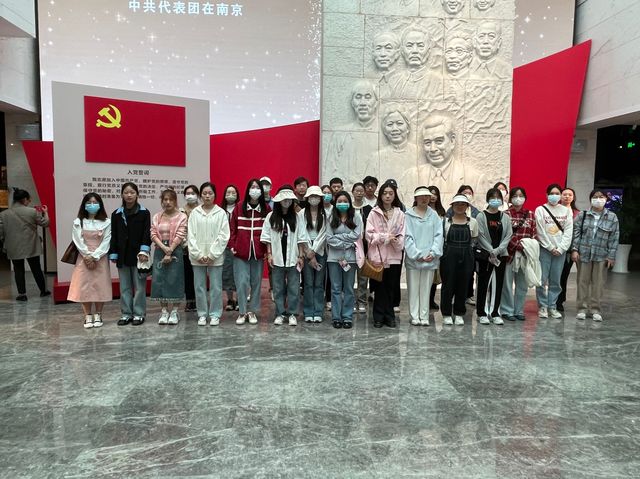 位于长江路东段的梅园新村旧址,是国共南京谈判期间,以周恩来为首的中共代表团在南京与国民党进行谈判的驻地。在这里,孕育并传播了梅园红色文化,培育并教育了一批又一批优秀共产党人。首先,同学们来到梅园新村周恩来的的铜像前,周恩来那坚定而从容的步伐,走在一段红色大理石铺成的道路上,这正像是周恩来一生所走过的是革命的红色道路。汉白玉浮雕上雕刻着中共代表团的七位领导同志——周恩来、邓颖超、董必武、吴玉章、叶剑英、陆定一和李维汉,他们名字的排列像一个倒“S”字形,这象征着中国革命走过的道路艰难曲折,也预示着中国革命事业将继往开来,千秋万世永传承。接着,同学们继续游览梅园新村纪念馆,细看馆藏革命文物,其无不蕴含着以周恩来为代表的共产党人高尚的品格情操、坚定的理想信念、无畏的革命精神。