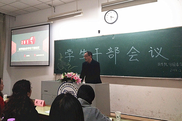 接着,鲍森副书记讲话,对全体学生干部提出三点要求:一是学生主业学习不能丢;二是无论职务大小,都应承担干部之责,在工作中锻炼提升能力;三是以身作则,起到模范带头作用。随后,崔昱老师对2017年团学工作作总结点评,并指出新学期的工作重心。最后,刘眉老师对新学期团学工作作了详细安排和建议指导,并传授学生干部工作方法。