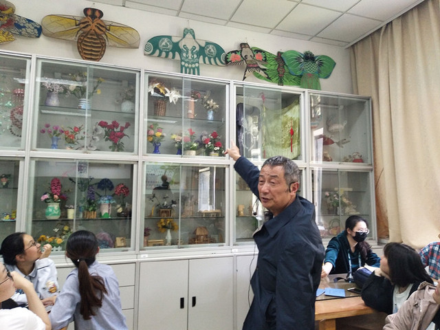 孙老师向学生们展示橱窗内的风筝