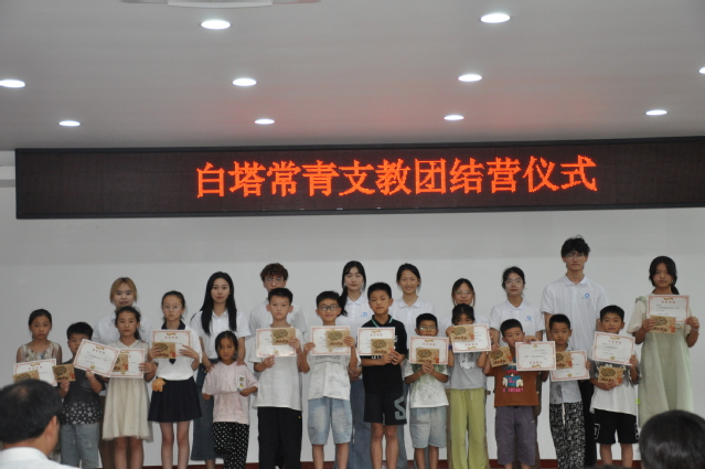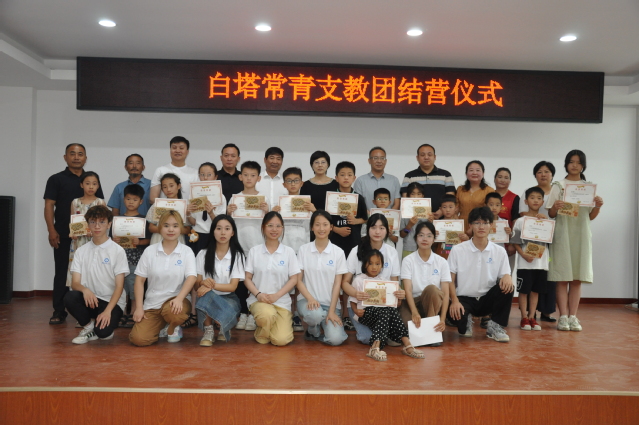 仪式在集体合影留念中结束。这张合影记录下此次参与支教活动师生的共同回忆和珍贵瞬间,也成为成为这段美好记忆的见证。指导老师王瑞和刘眉提到,通过这次支教,我们看到了支教团的努力和付出,也感受到学生们在暑期社会实践中取得的成长和进步。