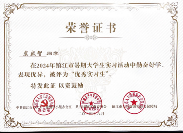 虞盛智同学获得镇江市优秀实习生荣誉