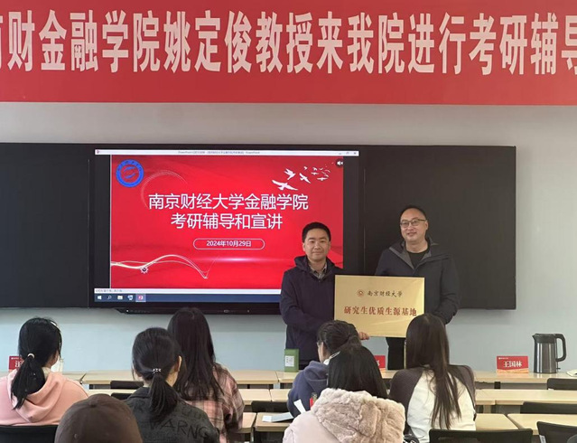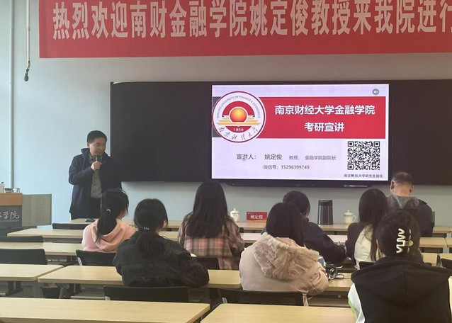 10月29日下午,南京财经大学金融学院院长姚定俊教授受邀来beat365官网进行考研辅导和宣讲。beat365官方网站党委书记(院长)赵彤教授、经济与金融专业负责人王国林副教授、相关专业同学参加此次活动。