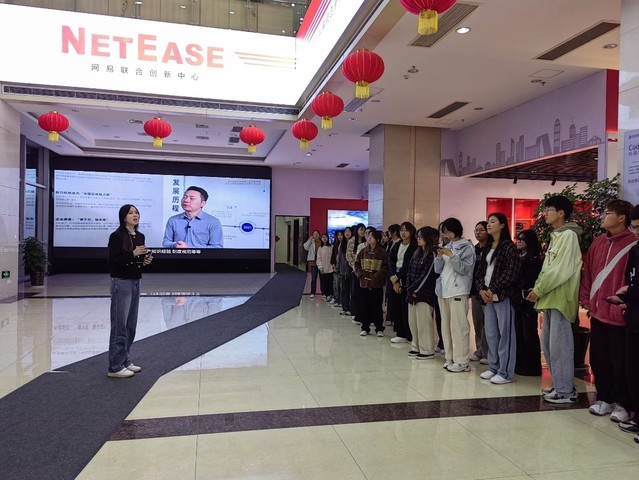 第四站,师生们参观了网易联合创新中心。该中心是镇江市润州区着力打造的一个数字经济产业园区。作为镇江市与网易公司联合打造的产业服务载体,旨在汇聚镇江市乃至江苏省各类创新创业资源要素为地方产业赋能,为入驻的数字经济类企业提供全方位技术支持和市场服务。工作人员详细介绍了网易互联网产品研发和运营模式,以及如何利用云计算、大数据等前沿技术推动传统产业升级和创新,为专业实践学习提供了借鉴与参考。