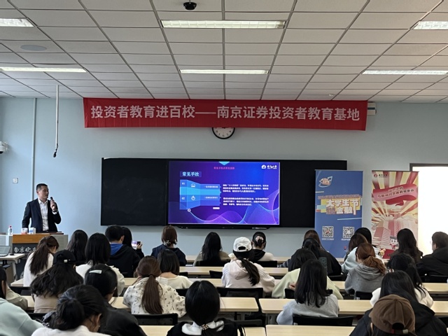 紧接着的是“金融知识进校园”主题宣讲活动。主办方特别邀请了南京证券投资顾问高杰为同学们开展了一场题为《证券市场基本情况与职业规划》的讲座。高杰顾问深入浅出地介绍了证券市场的基础知识,并对金融行业的职业发展路径进行了详细解读,使同学们对证券市场有了更深入的了解,对行业人才要求有了清晰的认识。讲座不仅增强了同学们对非法集资和金融诈骗的防范意识,也为他们的职业生涯规划提供了宝贵的指导。