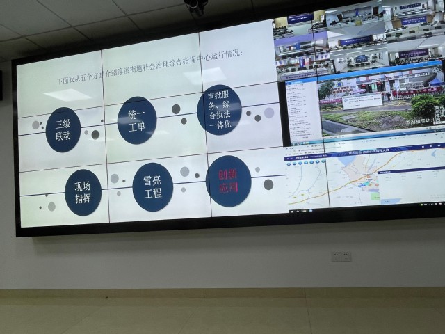 2023年10月27日,行政管理教研室教师、行政管理专业学生一行47人在高淳区委党校黄莹科长的陪同下,前往高淳淳溪镇政府展开联合调研。重点参观了淳溪街道社会治理综合指挥中心。该指挥中心设有指挥大厅、研判室、值班室等,二十四小时值班值守和应急响应制度,依托淳溪街道综合执法和审批服务一体化平台,实现对街道网格员、综合执法队员的联动指挥,保证随时对突发事件应急响应。例如疫情防控下的社区服务和孤寡老人上门服务等基本事宜,扁平化的组织管理和大数据的使用让工作人员迅速便捷地了解每家每户的情况,更快更好的为百姓解决问题。数字政府使决策走向科学化,社会治理实现精准化,公共服务达到高效化,也使政府治理体现了民主化。师生们对当下国家治理体系和治理能力的现代化,有了直观切身的感受。